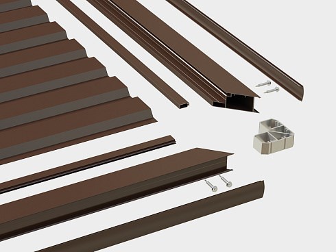 Поставляется набором алюминиевых профилей в порошковой окраске (RAL8017) с комплектом соединительных элементов, петель, метиза для сборки и монтажа.